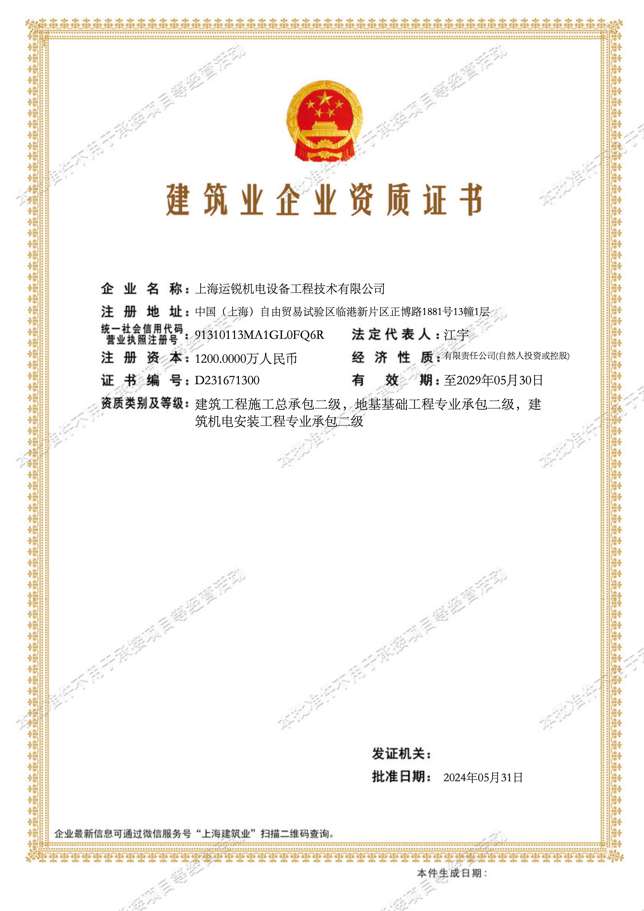 太阳成集团tyc122cc入口获批上海住建委颁发的建筑业企业资质证书,成为行业内唯一同时具备建筑工程施工总承包资质、钢结构制作与安装专业承包资质,地基基础工程专业承包资质、建筑机电安装工程专业承包资质的设备生产厂家。并获得质量管理体系认证、环境管理体系认证、职业健康安全管理体系认证等三体系认证。